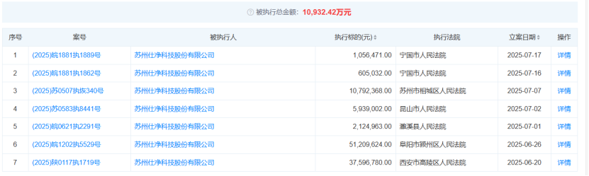 ![]() 光伏资讯 | PV-info 2025年7月以来,苏州仕净科技股份有限公司(301030)密集新增4起被扩张东谈主案件,累计扩张想法高达9687万元。重叠此前因要紧失火事故被判赔的1.4亿元债务,这家光伏环保缔造制造商的资金链正濒临空前危急。 七遭扩张一亿元,法则风险长入爆发 据公开法则记载自大,仕净科技在6月20日至7月17日短短几天内连气儿被七地法院列为被扩张东谈主: 宁国市法院,扩张想法105.6万元(案号:(2025)皖1881执1889号); 宁国市法院,扩张想法60.5万元(案号:(2025)皖1881执1862号); 苏州市相城区法院,扩张想法1079.2万元(案号:(2025)苏0507执恢340号); 昆山市法院,扩张想法593.9万元(案号:(2025)苏0583执8441号); 濉溪县法院,扩张想法212.5万元(案号:(2025)皖0621执2291号); 阜阳市颍州区法院,扩张想法5120.9万元(案号:(2025)皖1202执5529号) 西安市高陵区法院,扩张想法3759.6万元(案号:(2025)陕0117执1719号) ![]() 所有扩张总数已超亿元关隘。 业内分析指出,密集扩张不绝预示企业流动性已严重恶化,债务爽约参预法则清收阶段。 1.4亿失火抵偿:压垮资金链的“致命镣铐” 本次扩张危急背后,直指仕净科技未惩处的要紧历史抵偿株连: 隆基乐叶厂房失火案(2021年):因仕净提供的废气处理缔造电伴热带颓势激勉失火,经法院终审判决: 承担厂房死亡70%抵偿:3736.11万元(已成效); 缔造死亡一审抵偿:5807.9万元(尚未终审但计提压力浩大); 涉诉总本钱超1.4亿元,至极于其2024年净利润的75%,且公司因未实时败露该要紧诉讼,涉嫌信披违章,或濒临监管二次追责。 ![]() ![]() 财务筹划全线恶化,偿债智力亮红灯 2025年一季度财报已线路危局信号: