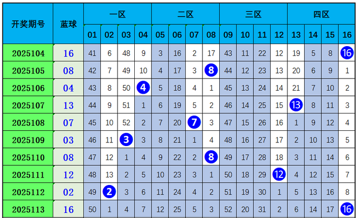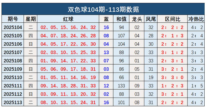双色球第2025113开奖奖号:红球08、10、13、15、24、31,蓝球16。和值101,龙头08,凤尾31,区间比2:2:2,冷热比4:2。蓝球开出大数号码16。